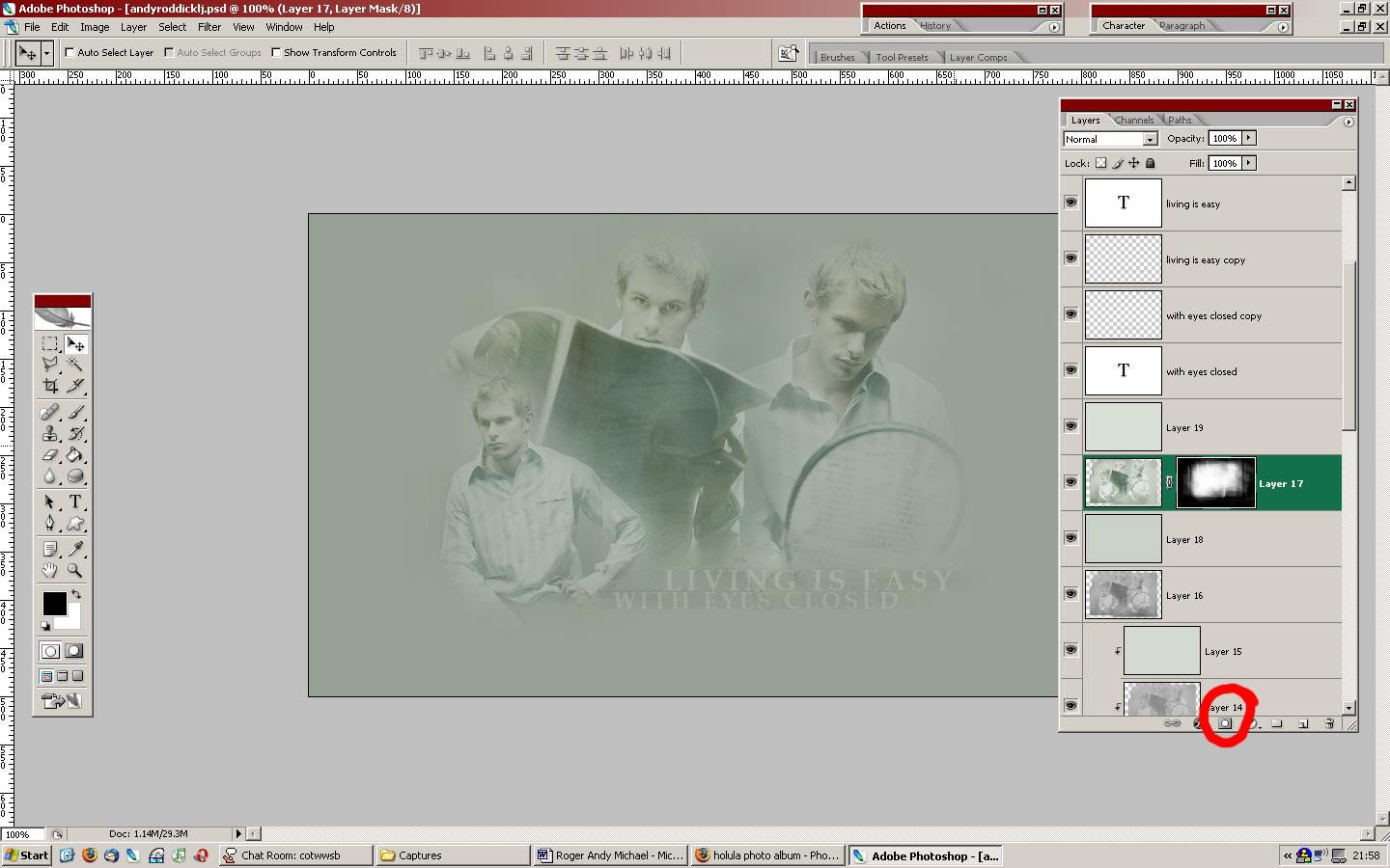 Date: 2006-01-16 10:09 pm (UTC)Here is Photoshop. Or, at least my Photoshop. (This is also me trying to multitask, and chat, fic and Photoshop all at the same time. It doesn't work.) Er, I digress. Anyway, see that little square with the circle inside that bright red circle which I drew on? That creates a layer mask. Select the layer you want to erase part of, and then click that button, and a white square thing will come up next to the selected layer thumbnail. Also, the colour pallete thing will have a black square and a white one behind it (as outlined). Basically, select the brush you want using the brush tool, and then make sure the layer mask is selected (not the layer itself) and use it as a normal brush, drawing in the parts of the layer you want to erase. The parts which are masked out come up as black, as you can see on layer 16. And then the layer underneath it will show through.